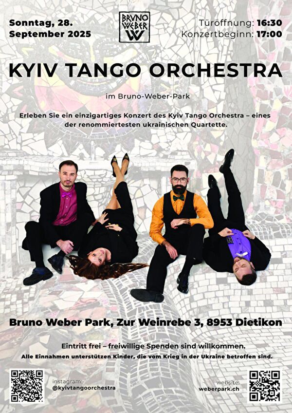 Erleben Sie ein einzigartiges Konzert des Kyiv Tango Orchestra - eines der renommiertesten ukrainischen Quartetten. Eintritt frei - freiwillige Spenden sind wilkommen. Alle Einnahmen unterstützen Kinder, die vom Krieg in der Ukraine betroffen sind.
