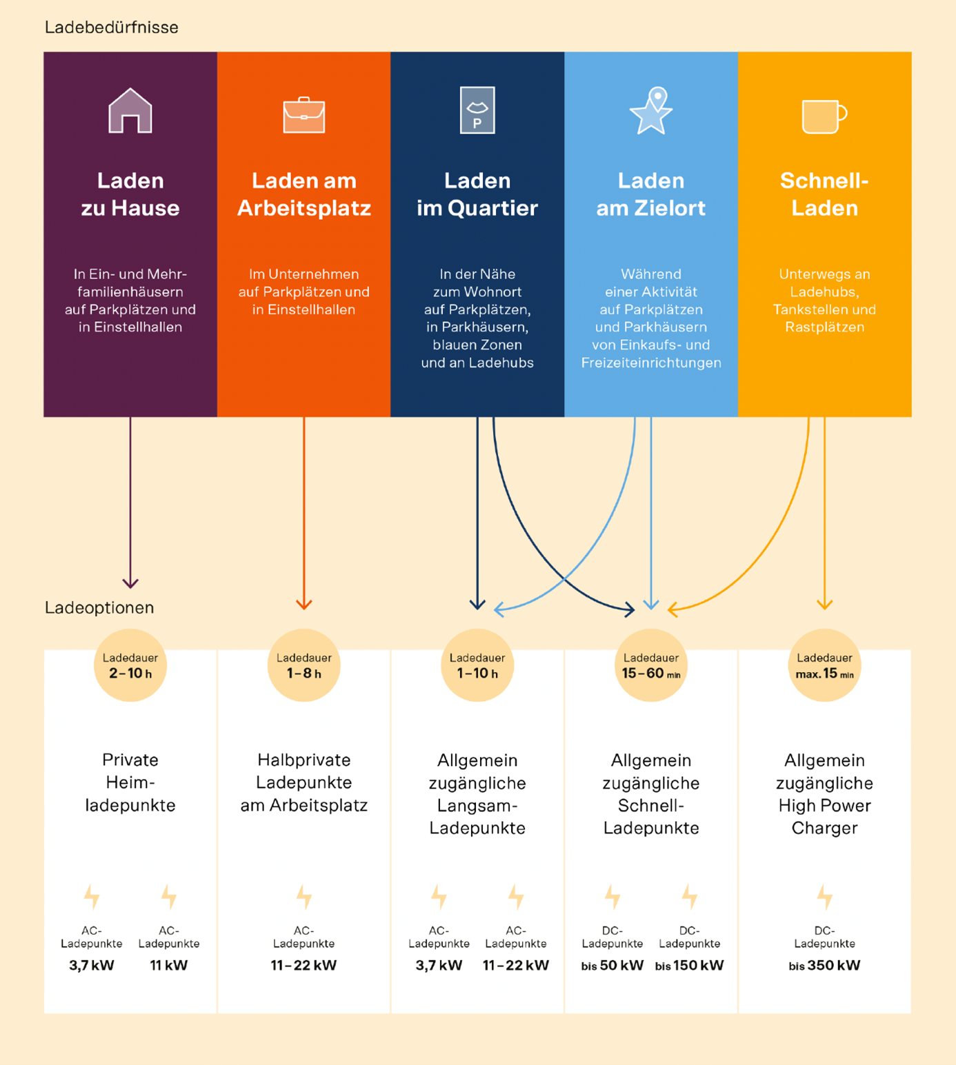 - Öffentliche Ladepunkte ergänzen dieses Angebot dort, wo keine anderen Möglichkeiten bestehen – insbesondere für Anwohnende ohne eigenen Parkplatz. Öffentliche Ladestationen sollen nach Möglichkeit auf bestehenden Parkierungsanlagen entstehen und gebündelt werden, um den öffentlichen Raum effizient zu nutzen.